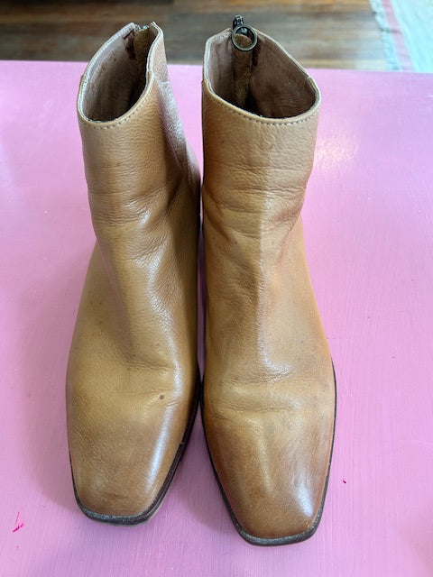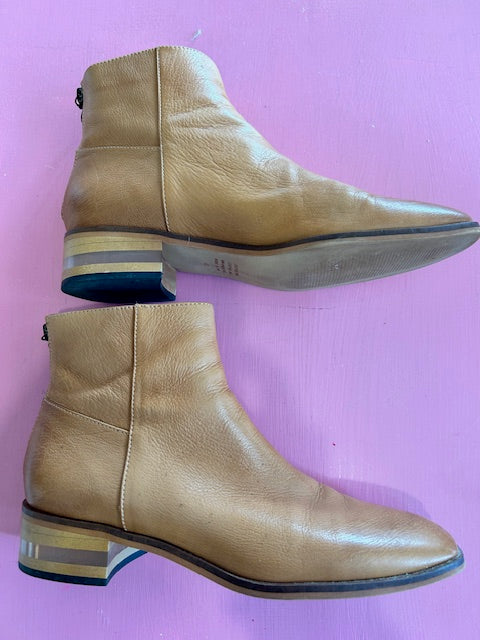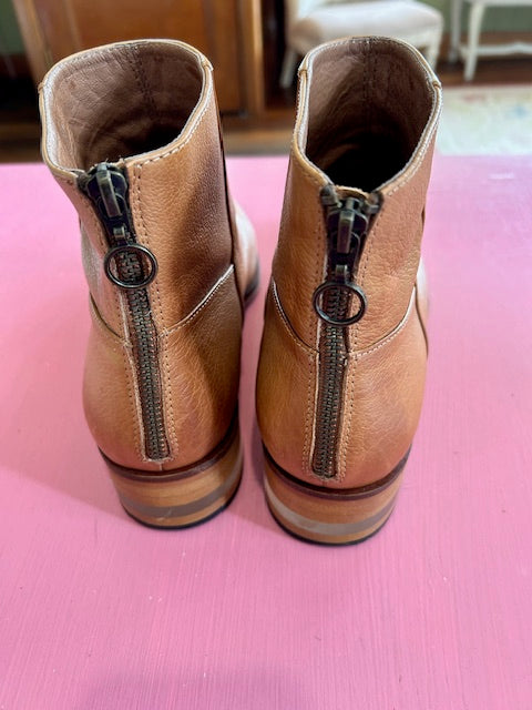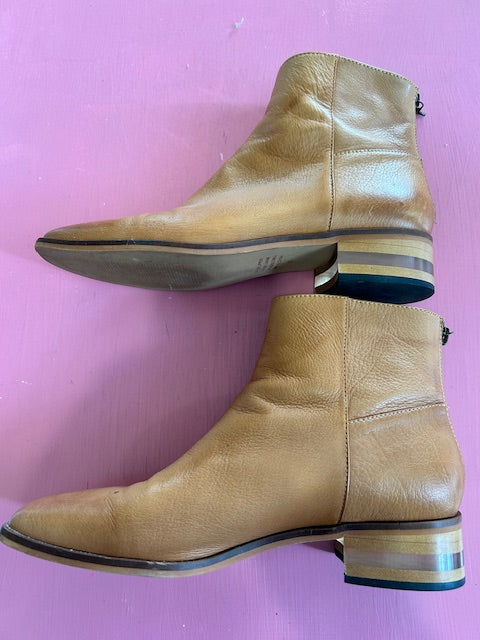 Love the handy back zip in these tan leahter boots with distinctive, see-through heel.