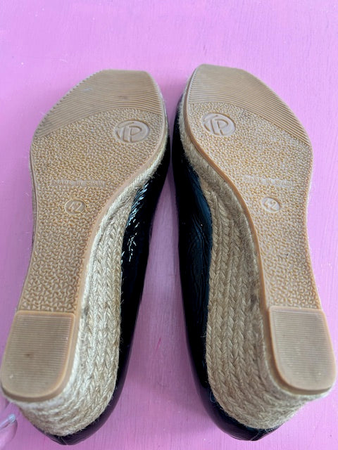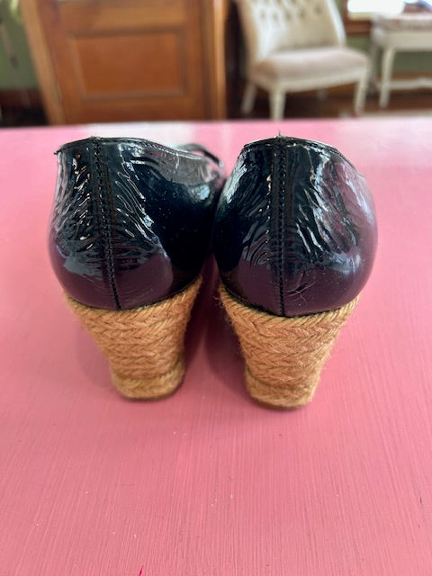 Peeptoe black patent leather sandals with espadrille wedge heel.