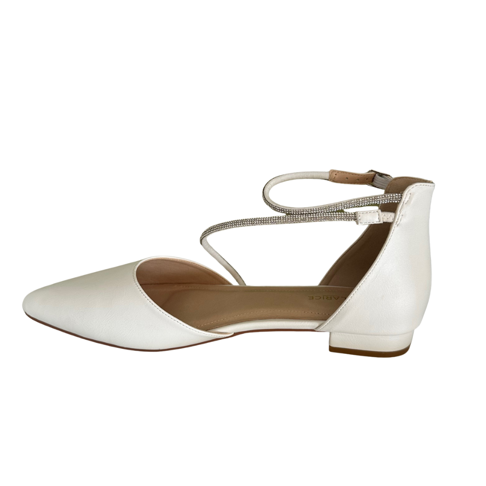 A lovely combination of diamante encrusted straps on these low heeled, closed toe shoes ... so elegant! Heel height is 1.5cm and these feature a leather footbed and synthetic upper.