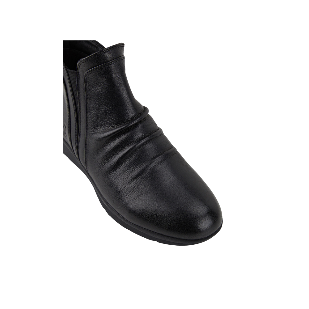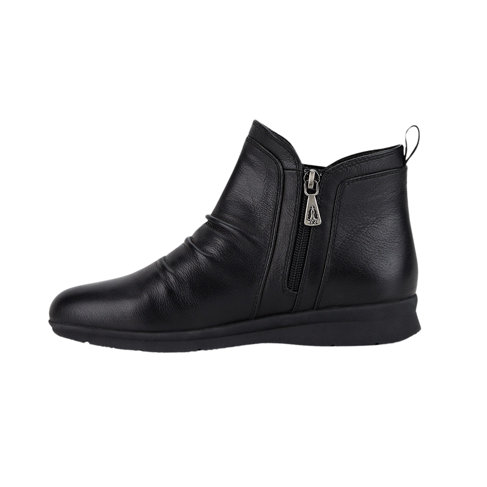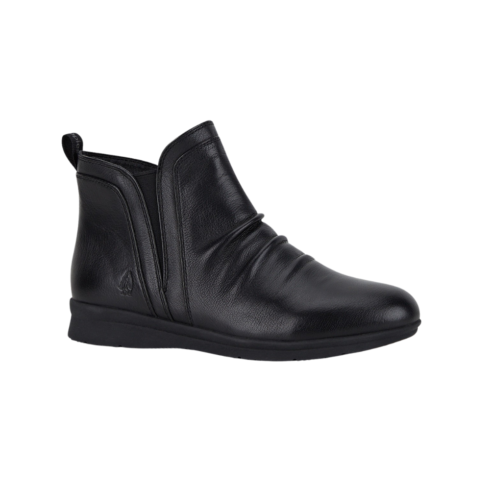 Welcome back to "Nerine", a classic boot by Hush Puppies with gentle ruching across the soft leather upper. Expect all-day comfort from these boots with a plush footbed made from latex and memory foam; soft synthetic lining; a side zip and pull tab for easy fitting; and a durable rubber outsole for grip and stability. The small wedge heel is 1cm.
